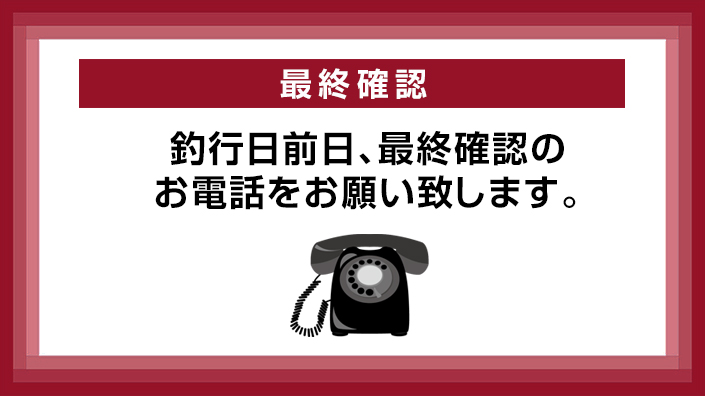 釣行日前日に、出船可否の最終確認について、お客様のご都合の良い時間帯にお電話をいただいております。(夕方5時迄)