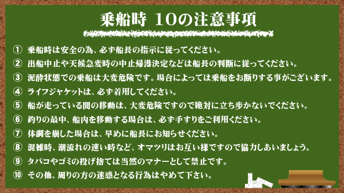 乗船時や航行中は、船長の指示に従って行動すると共に特に次の事項を守ってご乗船ください。